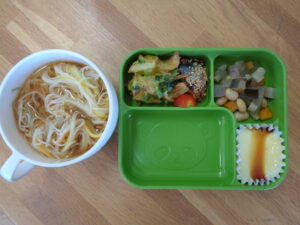 <本日の自園給食> そうめん さわらのゴマみそ焼き ほうれん草とカニカマのかき揚げ ミニトマト 五目煮豆 プリン