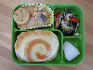 <本日の自園給食> 渦巻きミルクパン 鮭ときのこのグラタン アンパンマンポテト 海藻サラダ 梨