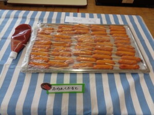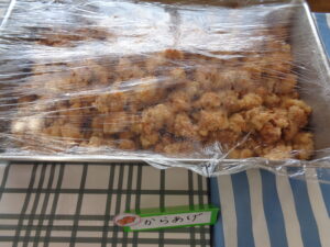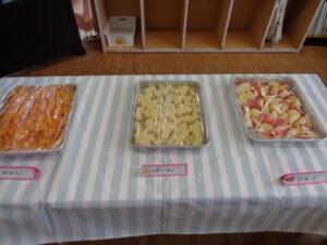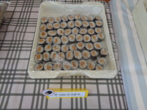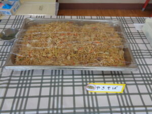 わかめおにぎり きつねのり巻き 焼きそば フランクフルト 鶏肉の唐揚げ フライドポテト たこ焼き 春雨サラダ メロンソーダゼリー チョコバナナムース りんご パイン缶 みかん缶