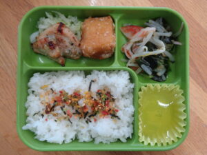 <本日の自園給食> やさいふりかけごはん 高野豆腐の竜田揚げ 鶏肉の磯辺焼き 千切りキャベツ わかめとカニカマの玉ねぎドレサラダ パインゼリー