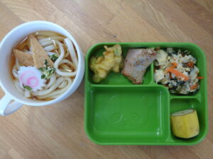 <本日の自園給食> あったかきつねうどん 鮭のスタミナ焼き コーンと枝豆のかき揚げ ニラと豆腐のチャンプル バナナ