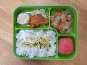 <本日のワンダー給食> たまごふりかけごはん バーベキューチキン えびしゅうまい 千切りキャベツ 大根のツナ煮 りんご