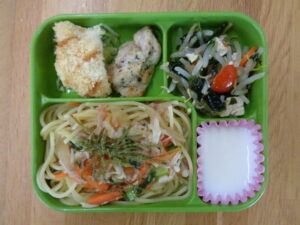 <本日のワンダー給食> 和風ツナスパゲティ チキンの香草焼き エビカツ 千切りキャベツ 豆腐サラダ 牛乳ゼリー