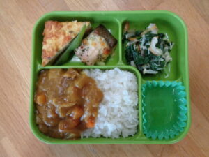 <本日の自園給食> カレーライス 鮭のチーズ焼き ふわふわオムレツ 枝豆 ほうれん草とちくわのさっぱりサラダ 青りんごゼリー