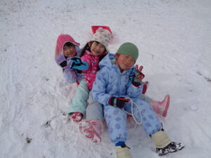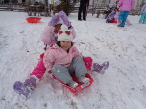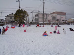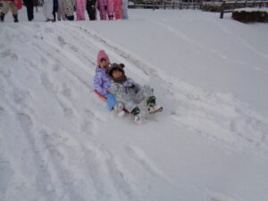年長さん、年中さん、年少さんは、そりを持って幼稚園の隣の成田東公園へ!