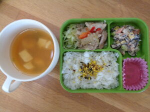 <本日の自園給食> たまごふりかけごはん 豚肉の生姜焼き 千切りキャベツ ひじきとレンコンのサラダ 豆腐のみそ汁 いちごゼリー