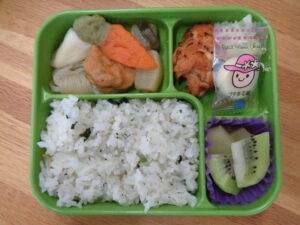 <本日の自園給食> しらすわかめごはん おでん タンドリーチキン 千切りキャベツ ピピピチーズ パインとキウイの盛り合わせ