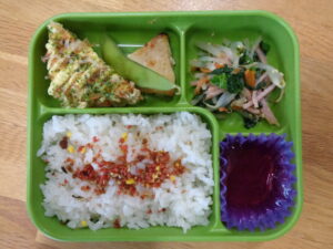 <本日の自園給食> すきやきふりかけごはん カレイのみそ焼き お好み焼き風卵焼き 枝豆 カラフルナムル ぶどうゼリー