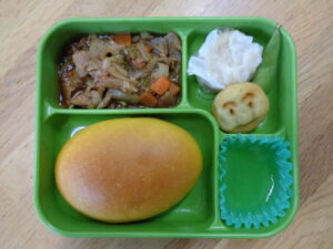 <本日の自園給食> 南瓜の米粉パン 根菜のハッシュドポーク イカしゅうまい アンパンマンポテト 枝豆 マスカットゼリー