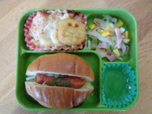 <本日のワンダー給食> ホットドッグ 鮭ときのこのグラタン アンパンマンポテト 大根とハムの玉ねぎドレサラダ 青りんごゼリー