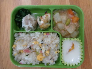 <本日のワンダー給食> チャーハン カジキの中華風ロースト 肉しゅうまい 蒸し小松菜 大根のツナ煮 みかん入り牛乳ゼリー
