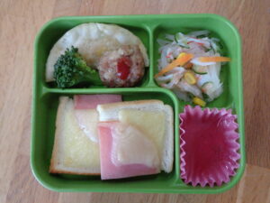 <本日の自園給食> ハムチーズトースト 南瓜とツナの包み揚げ 一口ハンバーグ ブロッコリー 大根とカニカマの玉ねぎドレサラダ いちごゼリー