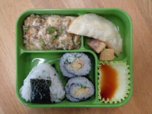 <本日の自園給食> ツナマヨのり巻き&しらすわかめおにぎり 麻婆豆腐 はんぺんとチーズの包み揚げ きなこおさつ プリン
