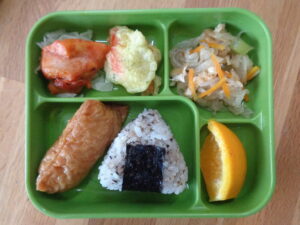 <本日の自園給食> 梅しそおにぎり&おいなりさん バーベキューチキン カニカマの磯辺揚げ 千切りキャベツ 切干大根の煮物 オレンジ