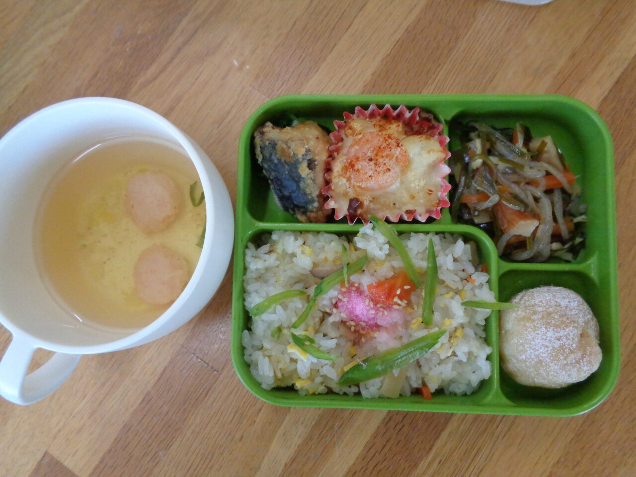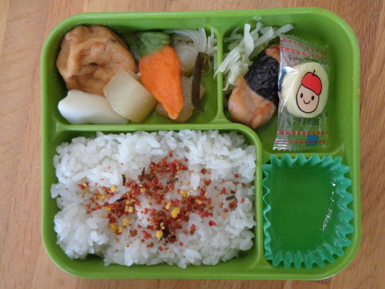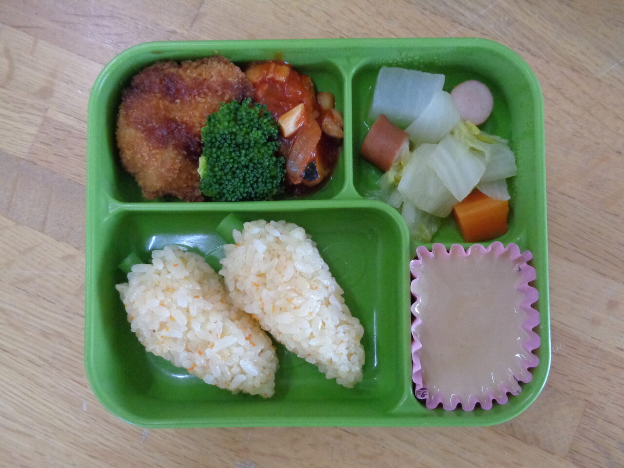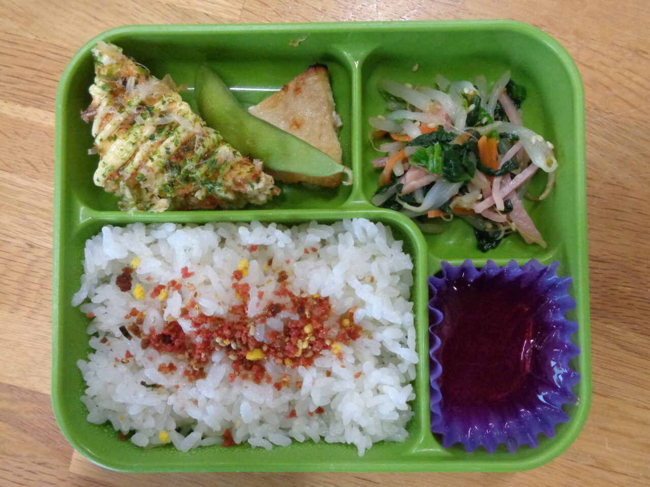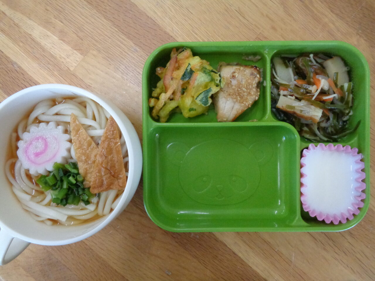 <本日の自園給食> あったかきつねうどん カジキのゴマ照り焼き ほうれん草とウィンナーのかき揚げ すき昆布の煮物 牛乳ゼリー たくさんの子どもたちが、うどんをおかわりして食べていましたよ! 全クラス、おかわり分も完売!&