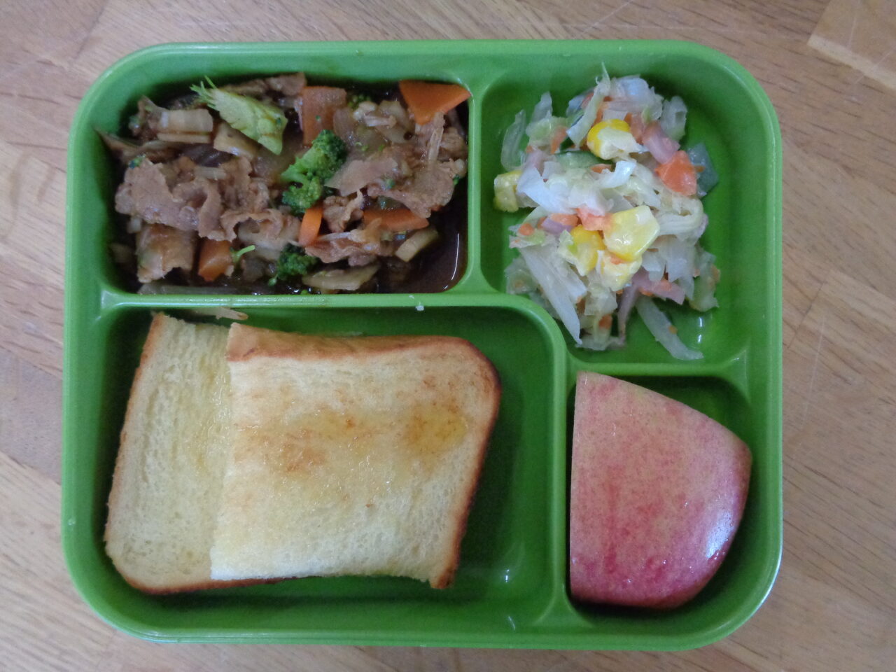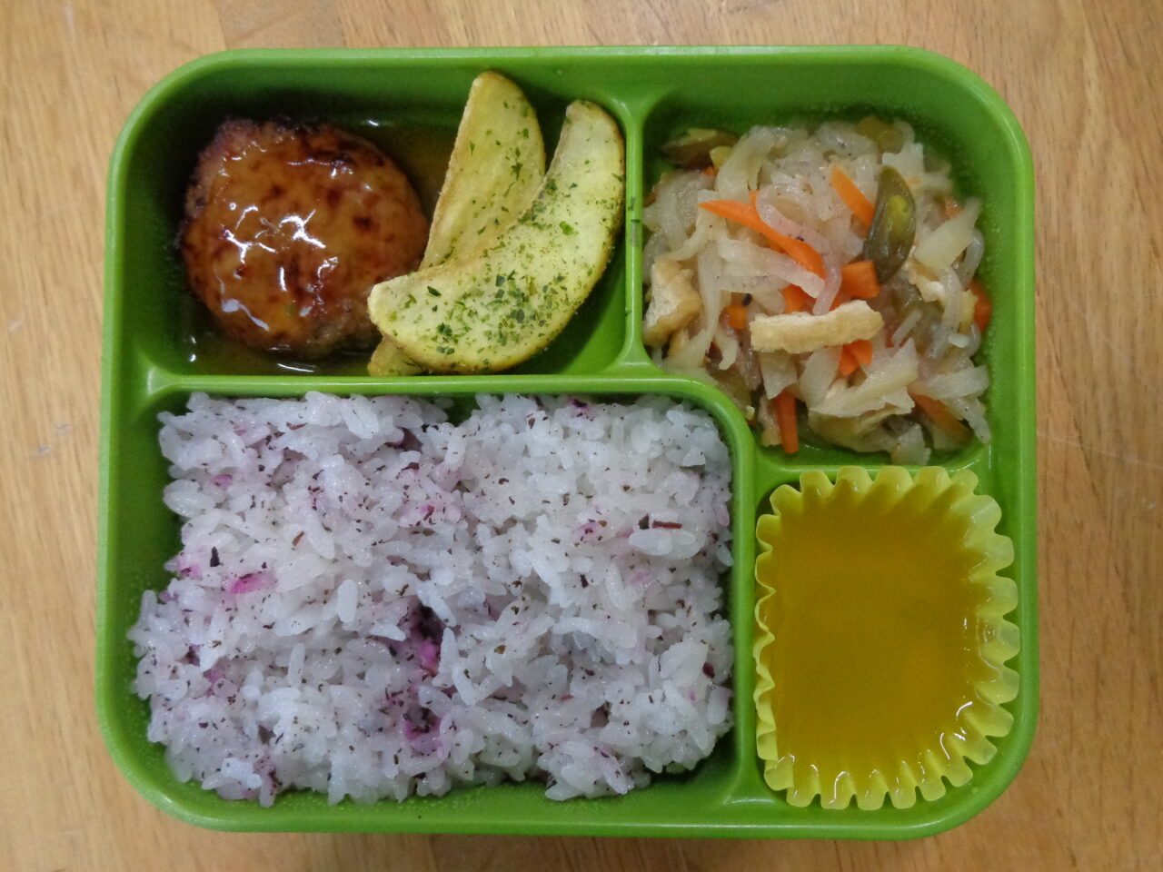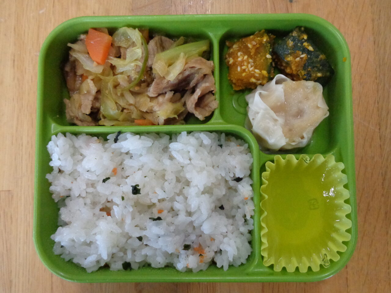 <本日の自園給食> 南瓜の米粉パン 根菜のハッシュドポーク イカしゅうまい アンパンマンポテト 枝豆 マスカットゼリー