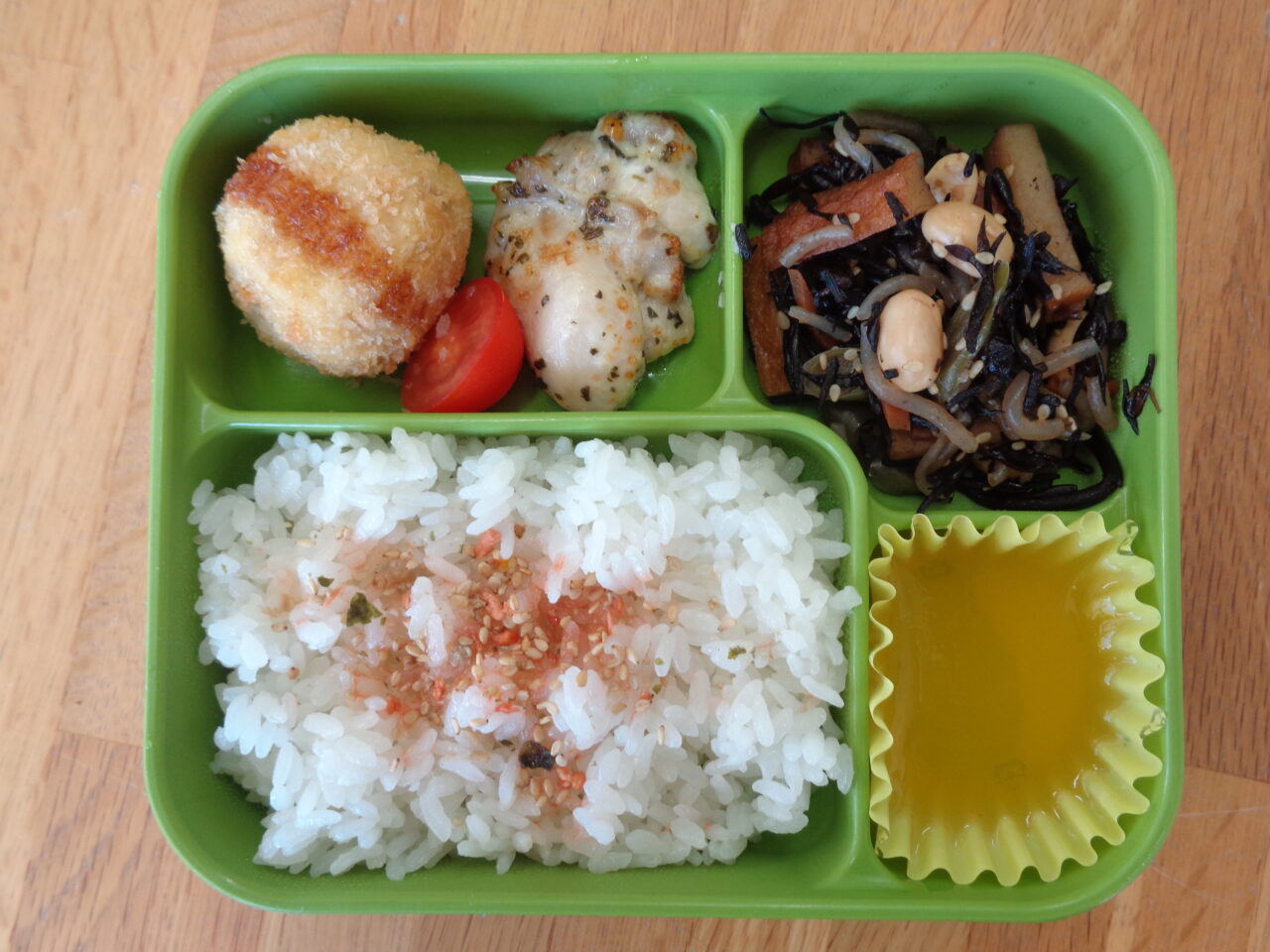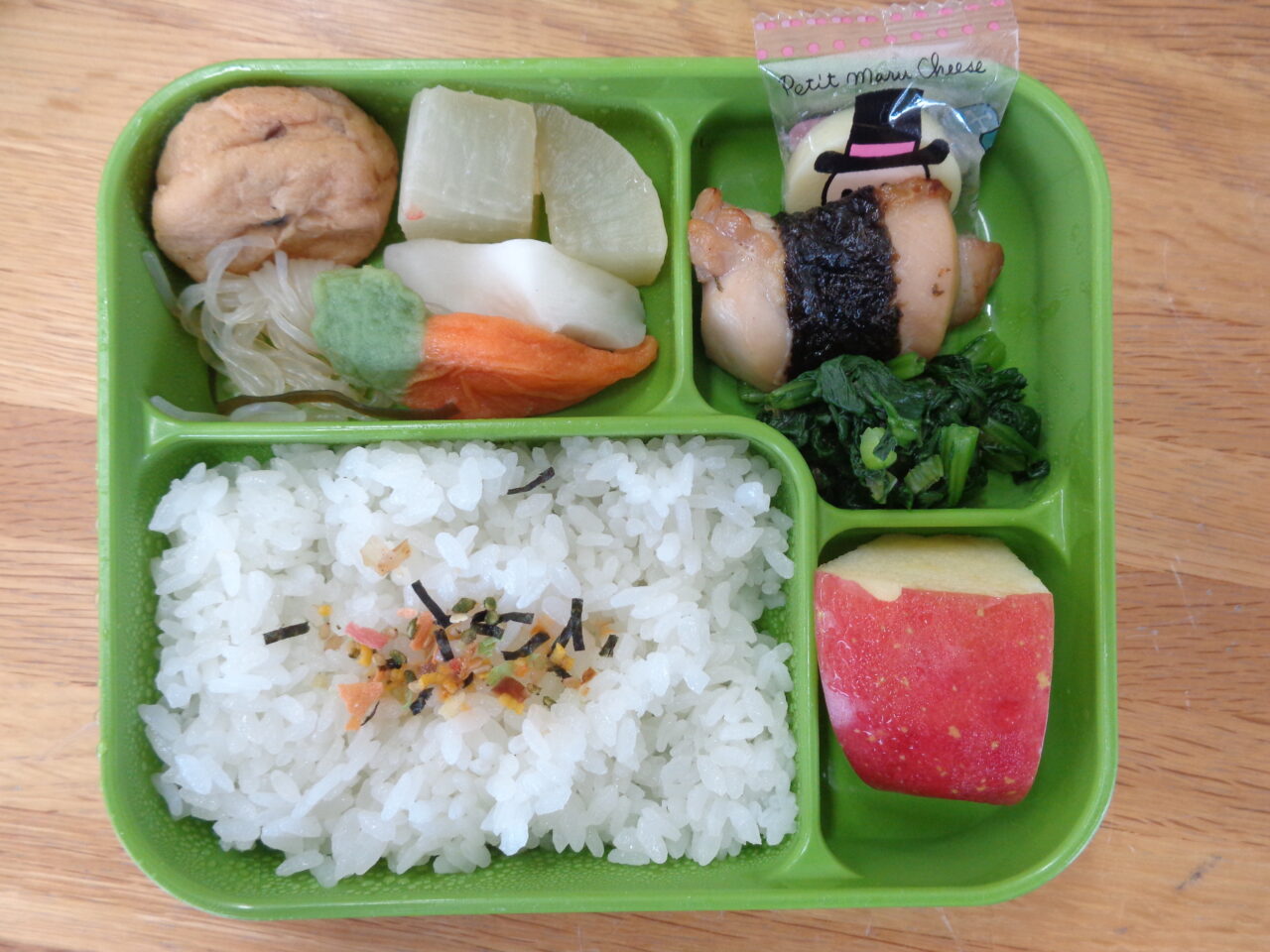 <本日の自園給食> ツナマヨのり巻き&ひじきおにぎり 豚肉のチャプチェ風 キャベツとハムのゴマドレサラダ いちごゼリー