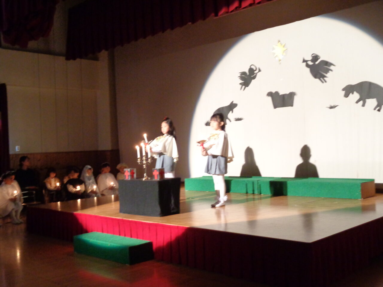 イエス様のお誕生をお祝いしようとみんなで心を合わせて取り組んでいる降誕劇。 今日は年中さんや年少さん、プレ年少さんの前で披露してくれました。 ⭐第1部 キャンドル礼拝 +
