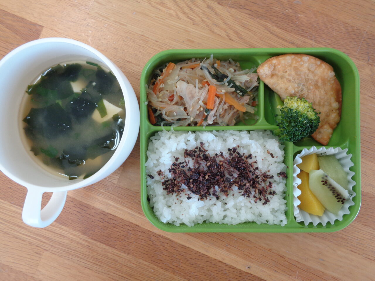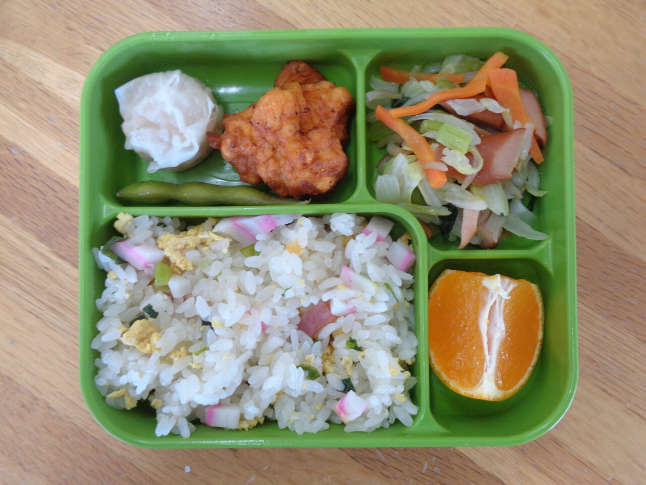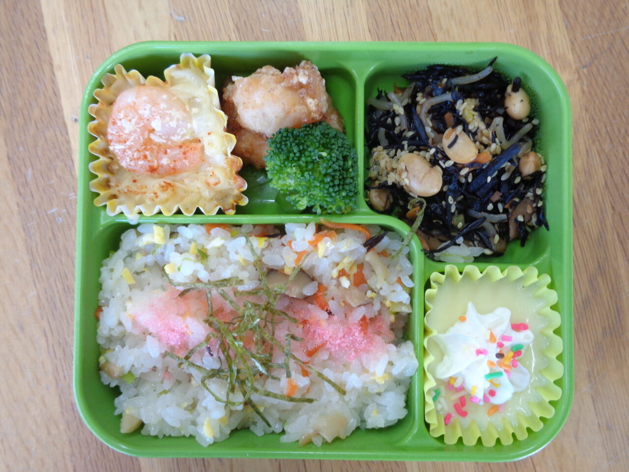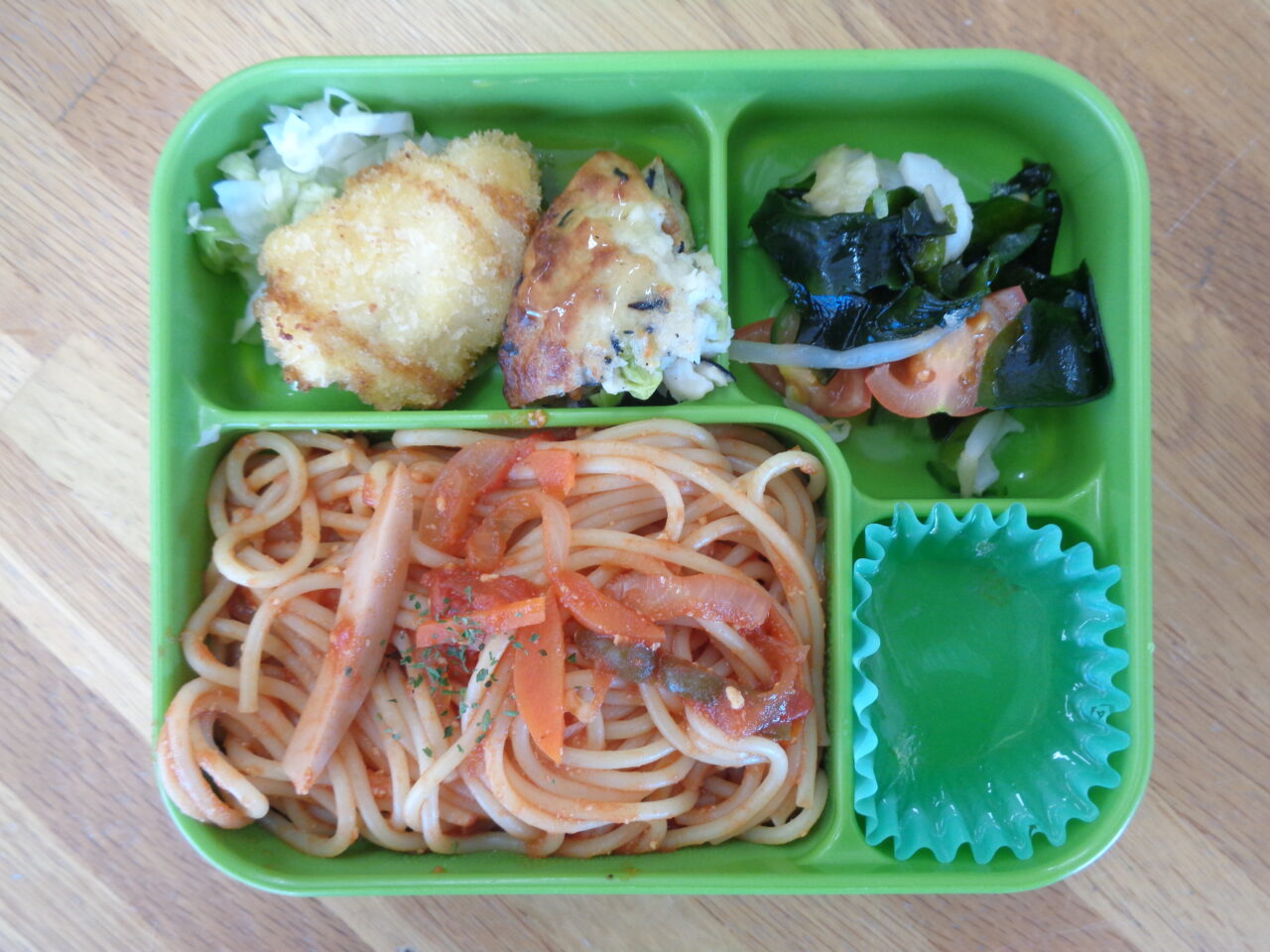 <本日の自園給食> ナポリタンスパゲッティ お魚ハンバーグ ささみフライ 千切りキャベツ 海藻サラダ 青りんごゼリー